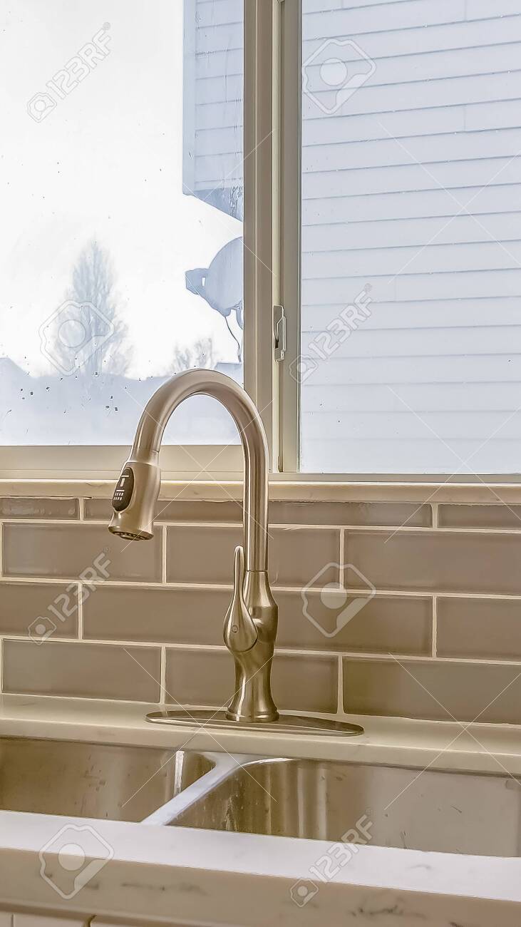 Vertical Double Sink And Faucet Of A Kitchen With View Of Outdoors