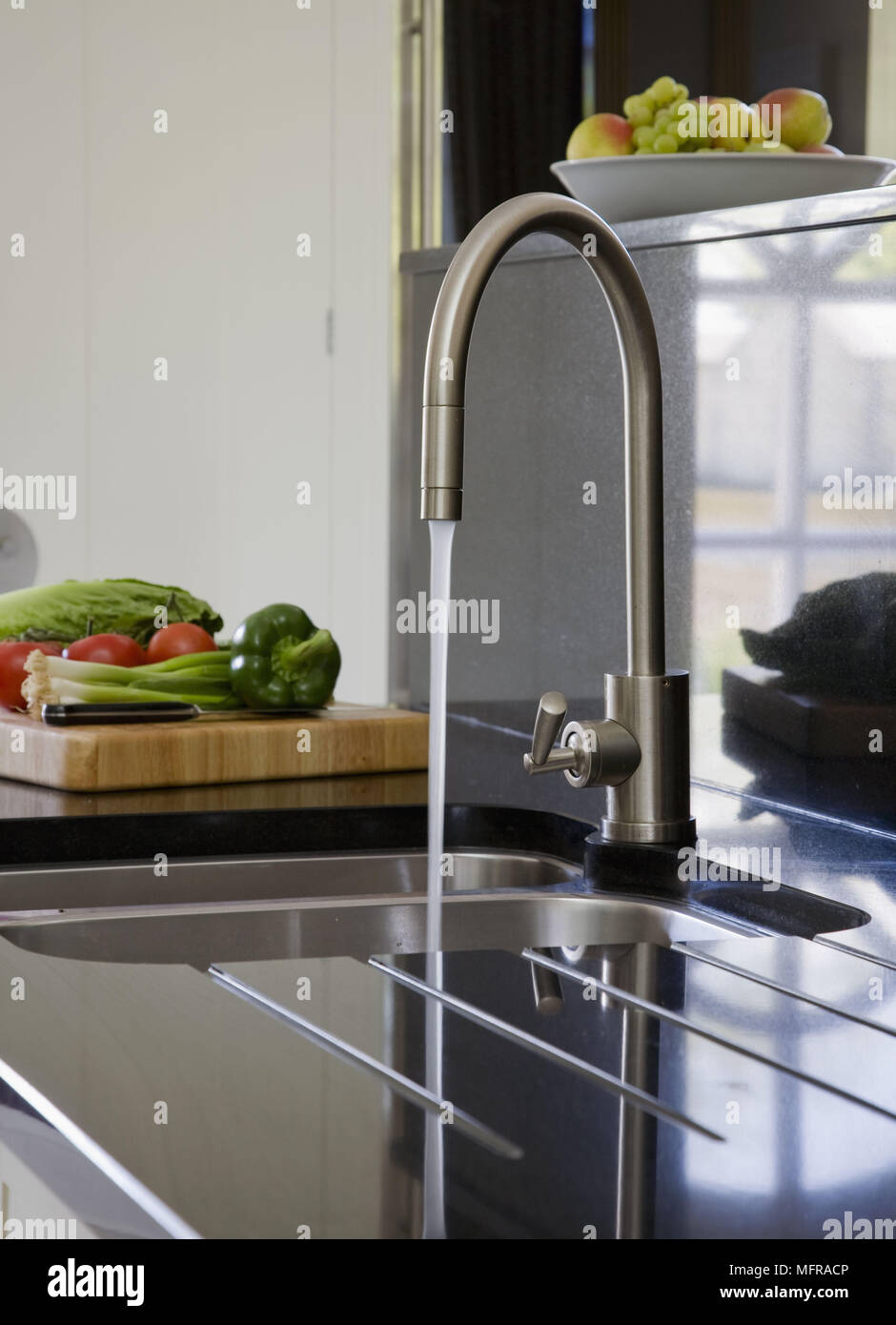 Water Running From Stainless Steel Tap Fitting Over Sink In Modern