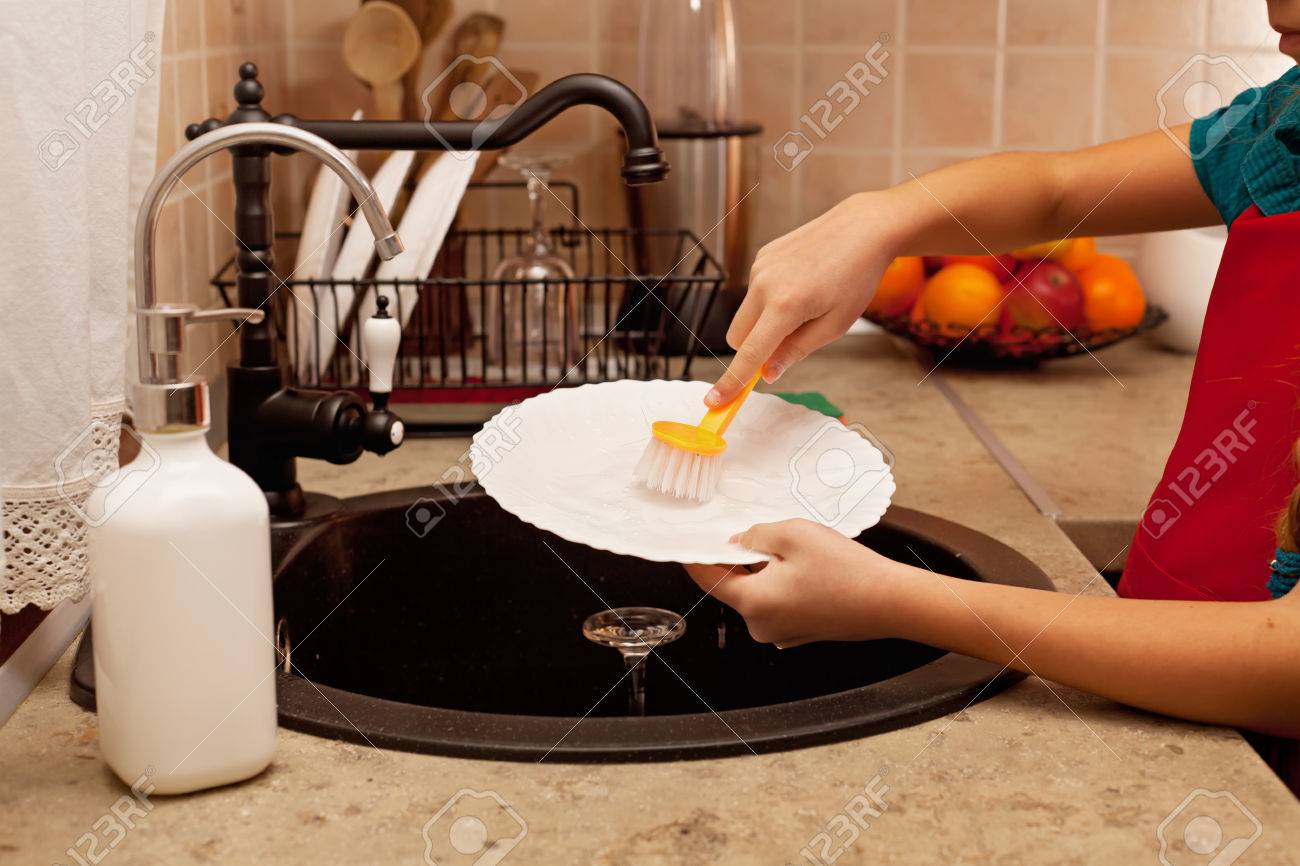 Child Hands Washing The Dishes At The Kitchen Sink Closeup