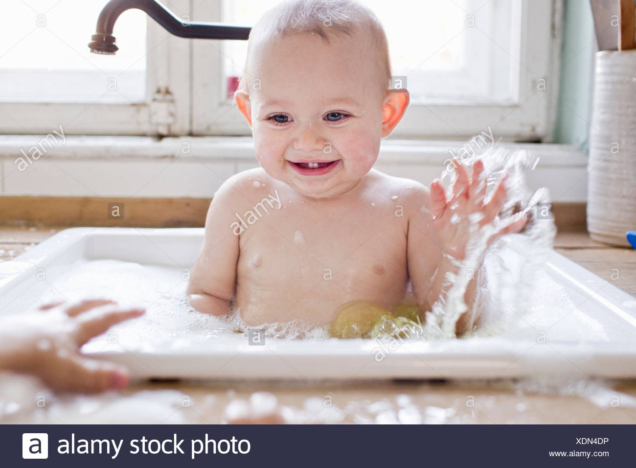 Baby Boy Splashing Whilst Bathing In Kitchen Sink Stock Photo