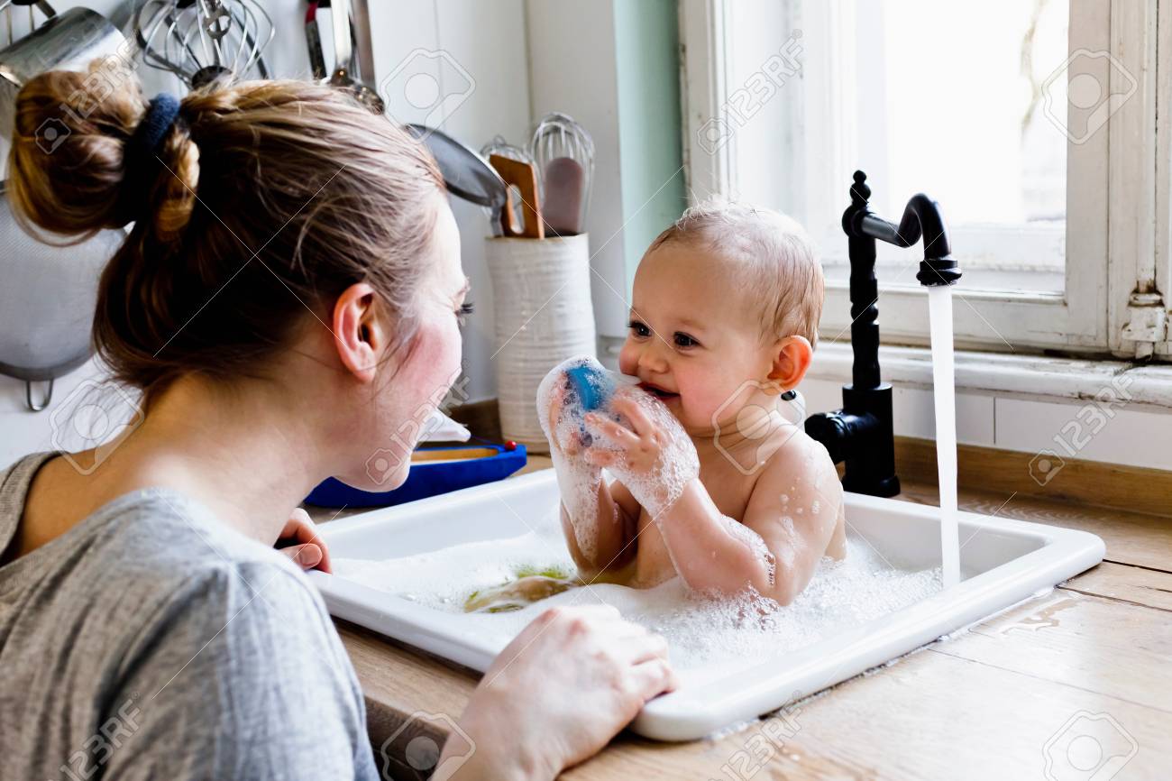 Mother Bathing Baby In Kitchen Sink High Res Stock Photo Getty
