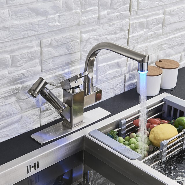 Brushed Nickel Led Kitchen Sink Faucet Pull Out Spray Single Hole