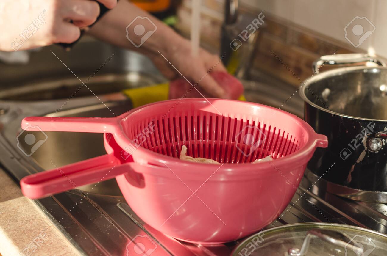 View On Kitchen Sink With Woman Hands Washing The Dishes With